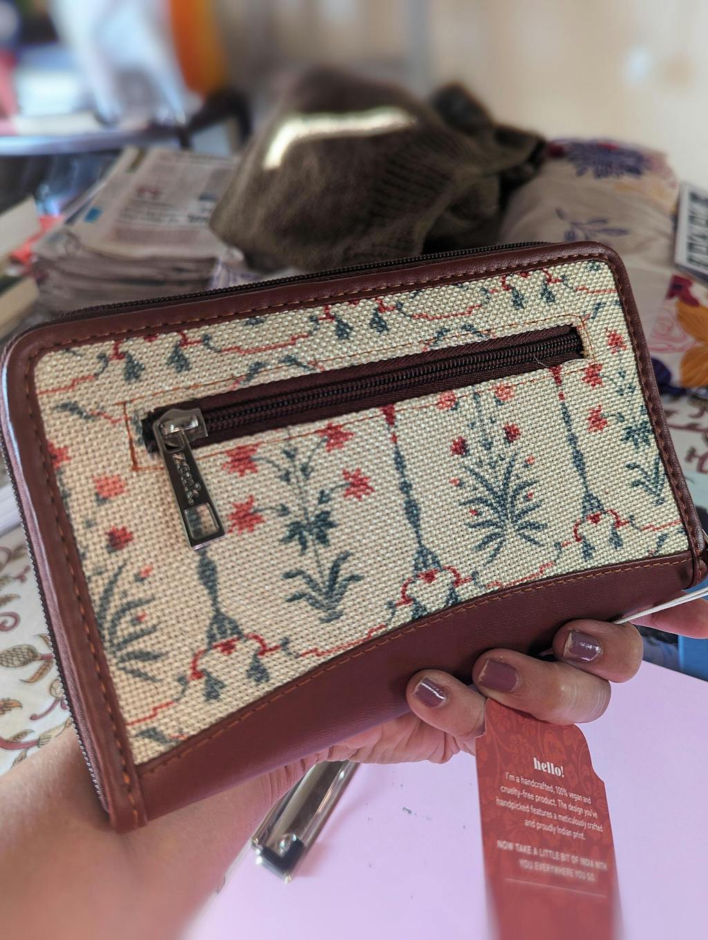 This is a Proudly Indian and 100% PeTA approved Vegan product with a Stylish Print. It is sturdy and durable with zipper closure.