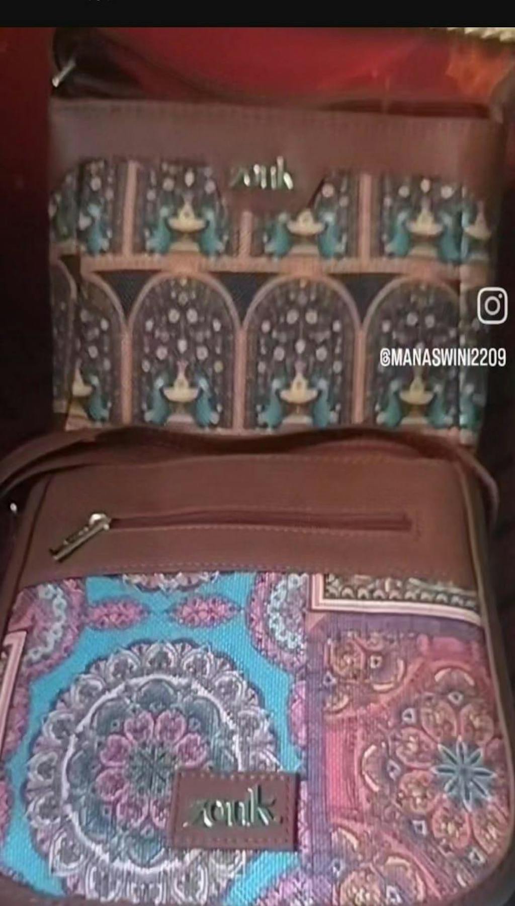 Material Used - Vegan Leather, Handicraft Fabric, Water-resistant inner lining, premium nickel finished accessories.